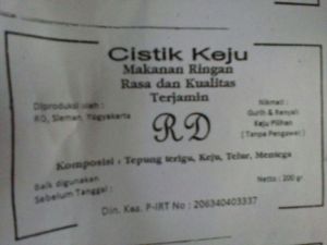Cistik Keju “Makanan Ringan Rasa dan Kualitas Terjamin”, kalimat ini tertera sebagai lebel Produk pangan Industri Rumah Tangga (PIRT) dengan Depkes P-IRT Nomor : 20634040337. Merk dagang “RD”, juga tertera dalam setiap kemasan. Namun ada kalanya tidak diberi lebel sesuai dengan pesanan dari toko tersebut, hal ini disampaikan mas Rudi sebagai pemiliki usaha ini. Dia masih kerabat dari Kissparry beralamat di Sleman Jogjakarta.