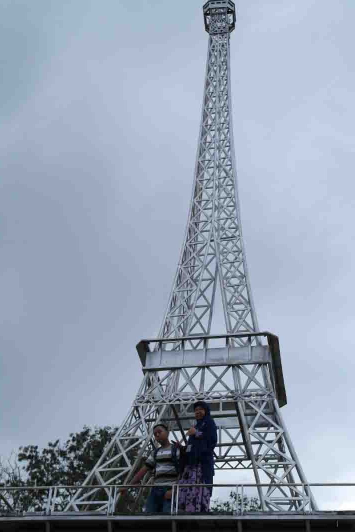 Pengunjung bisa naik ke miniatur Menara Eifel ikon wisata Perancis di Benua Eropa, namun dibatasi maksimal 6 orang dipelataran Eifel sehingga harus bergantian.