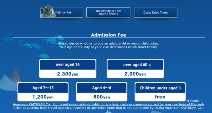 Boleh diamati sekilas tentang harga tanda masuk (HTM) akuarium Osaka ini, yang menarik adalah untuk Lansia (lanjut usia) diatas 60 tahun 2,000yen, dan usia produktif 2,300yen. Usia antara 7 – 15 tahun 1,200yen.