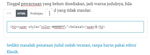 Ada, cara membuat agar tidak perlu melakukan editing dengan model html. Caranya dengan mengembalikan sebagian Blok ke mode Klasik, khusus yang teks tertentu, yang akan kita modifikasi.