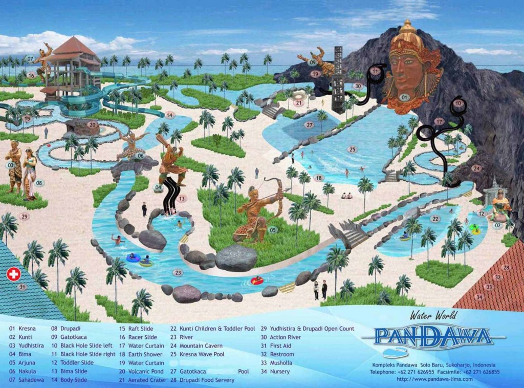 Patung Pandawa lima yang dibangun untuk memperindah pemandangan dibuat dalam ukuran besar. Patung Kresna setinggi 37 meter nampak gagah menghiasi gua buatan yang di bawahnya dikitari genangan air kolam. Banyak wahana petualangan air yang menarik seperti bungy jumping, black hole, bungy river, wave pool, raf slide, racer slide, kiddy pool, dan wahana yang lainya.