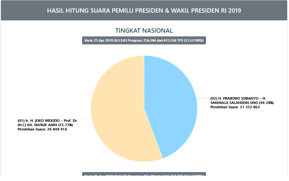 Real count KPU untuk Pemilu 2019 yang juga ditayangkan dengan Situng-nya KPU, diketahui dari perhitungan yang tampilkan oleh KPU tersebut, hingga 25 April 2019 pukul 02:15:05 telah terlaporkan 31,52% atau telah mencapai 256.384 TPS dari total TPS sejumlah 813.350.