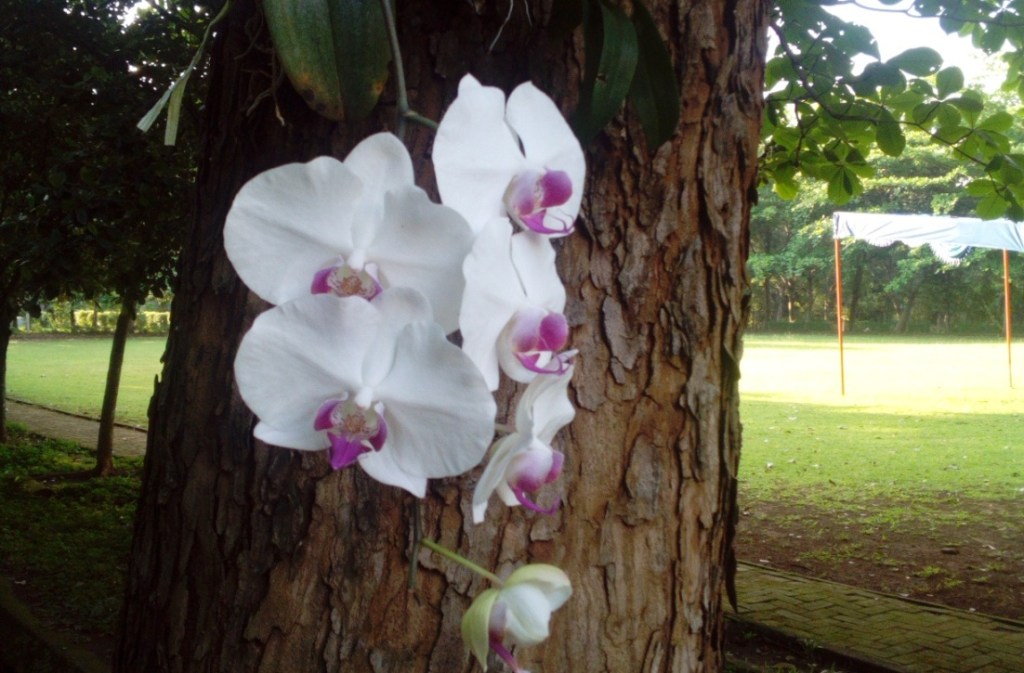 Dan bunga anggrek yang ditempel di pohon, tidak semuanya mati, dan masih banyak yang bertahan hidup dan menempel di pohon tersebut.
