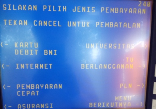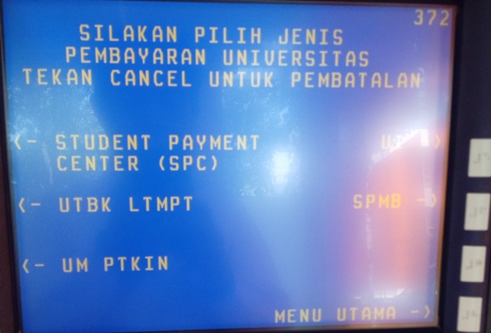 Anjungan Tunai Mandiri (ATM) dapat untuk melakukan berbagai transaksi termasuk membayar biaya pendidikan atau biaya pendaftaran calon mahasiswa baru.