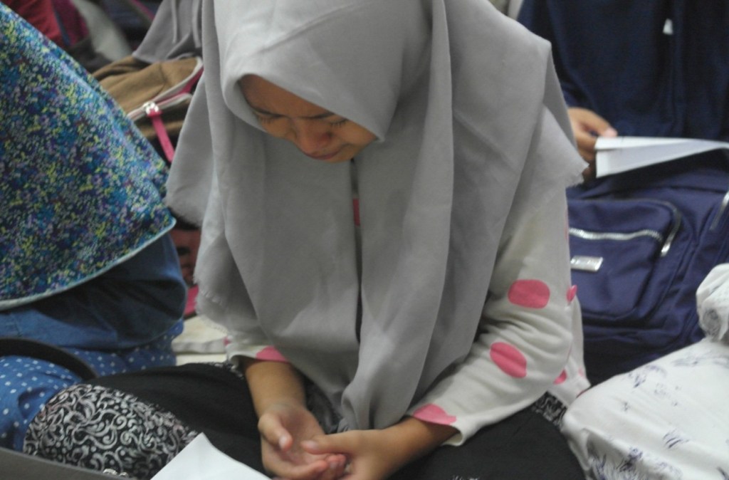 Santri kerudung coklat yang benar-benar menangis tersedu-sedu dan paling keras diantara peserta yang lainnya.