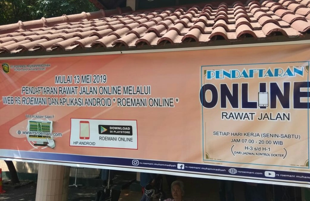 Seperti halnya terlihat di papan spanduk informasi di depan Rumah Sakit Roemani Semarang, terpampang tulisan pengumuman bahwa pendaftaran rawat jalan atau ke kontrol dokter poliklinik sejak 13 Mei dilakukan secara online.
