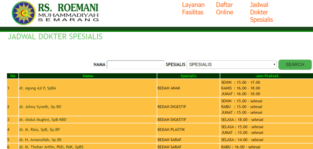 Untuk mengetahui jadwal dokter dapat dicari dengan menu yang ada dengan tag NAMA atau SPESIALIS, klik search.