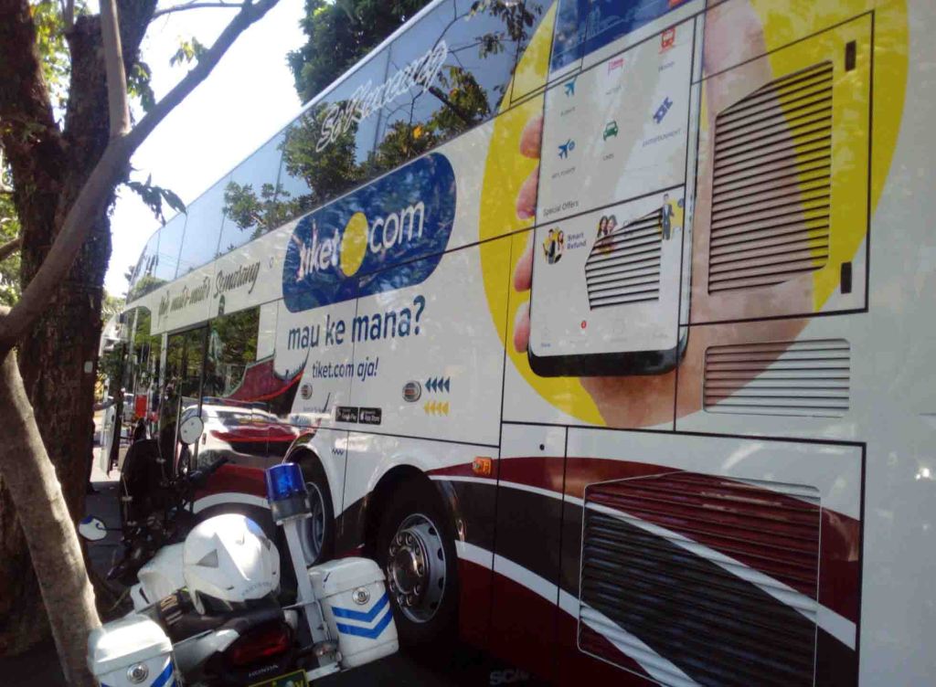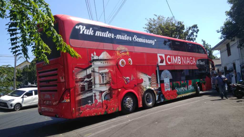 Pada badan bus tertera tulisan “Yuk Muter-muter Semarang”, ayo keliling Semarang.