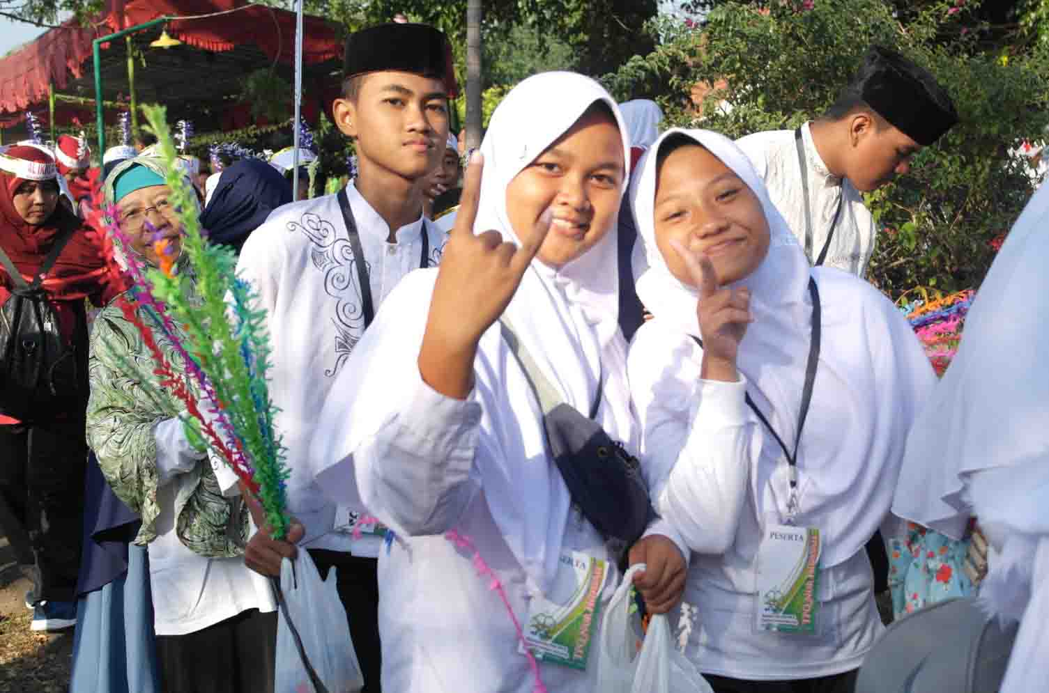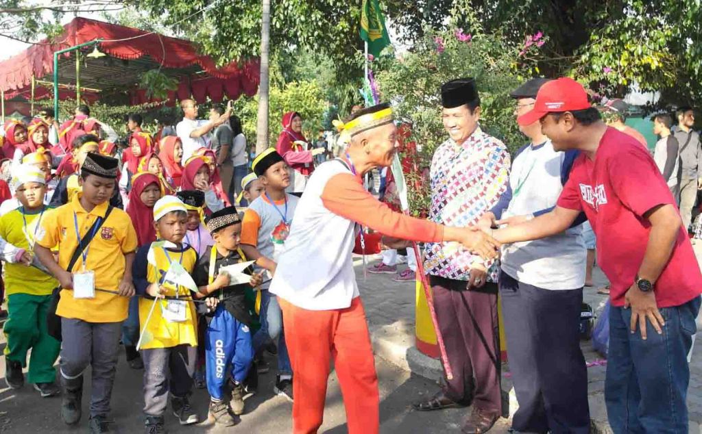Santri peserta jalan sehat diajak tepuk anak sholah, dan diberi pertanyaan agar menyebutkan jumlah malaikat dan nama-namanya.