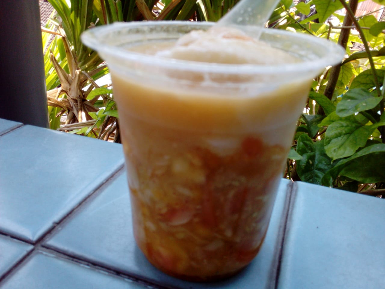 Suhu udara siang di Semarang yang cukup terik membuat rujak es krim ini sudah tidak tampak lekukan eskrimnya karena sudah sedikit mencair.