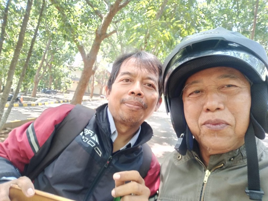 Aku jawab “pulang dulu naruh tas, makan, sholat, dan ke rumah sakit diantar oleh istri…, meskipun diantar tapi saya yang “nggoncengke“