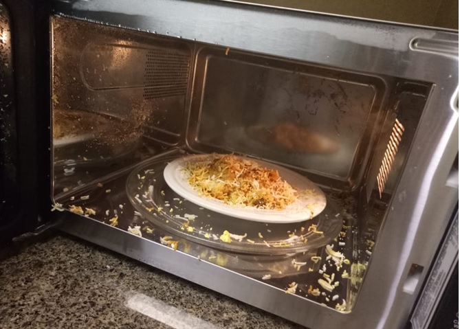 Memandang kulkas sesaat dan spontan teringat ada nasi briani lengkap dengan lauknya di dalam kulkas. Saat itu saya berfikir, neh….. bagaimana biar makanan menjadi panas atau hangat, cukup di panaskan didalam microwave maka sudah beres, begitu yang terlintas di pikiranku.