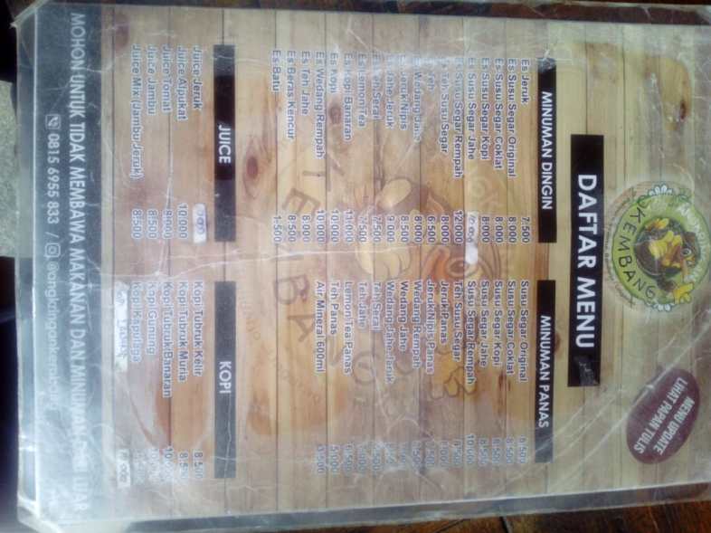 Menu bervariasi dengan harga terjangkau, silakan melihat daftarnya. Perlu kami sampaikan disini bahwa menu dan harga dapat berubah sewaktu-waktu, daftar menu dan harga yang benar saat Anda melakukan transaksi langsung di Angkringan Kembang.