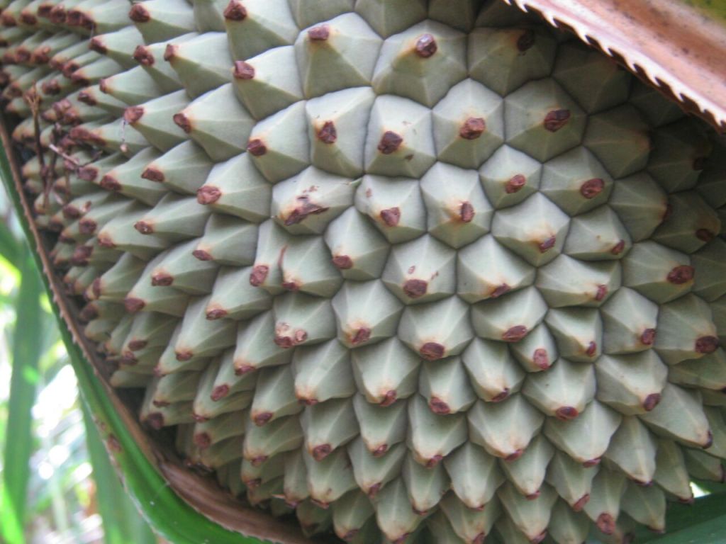 Bentuk kulit buahnya seperti kulit buah nangka, tetapi buahnya dilindungi daun bergerigi.