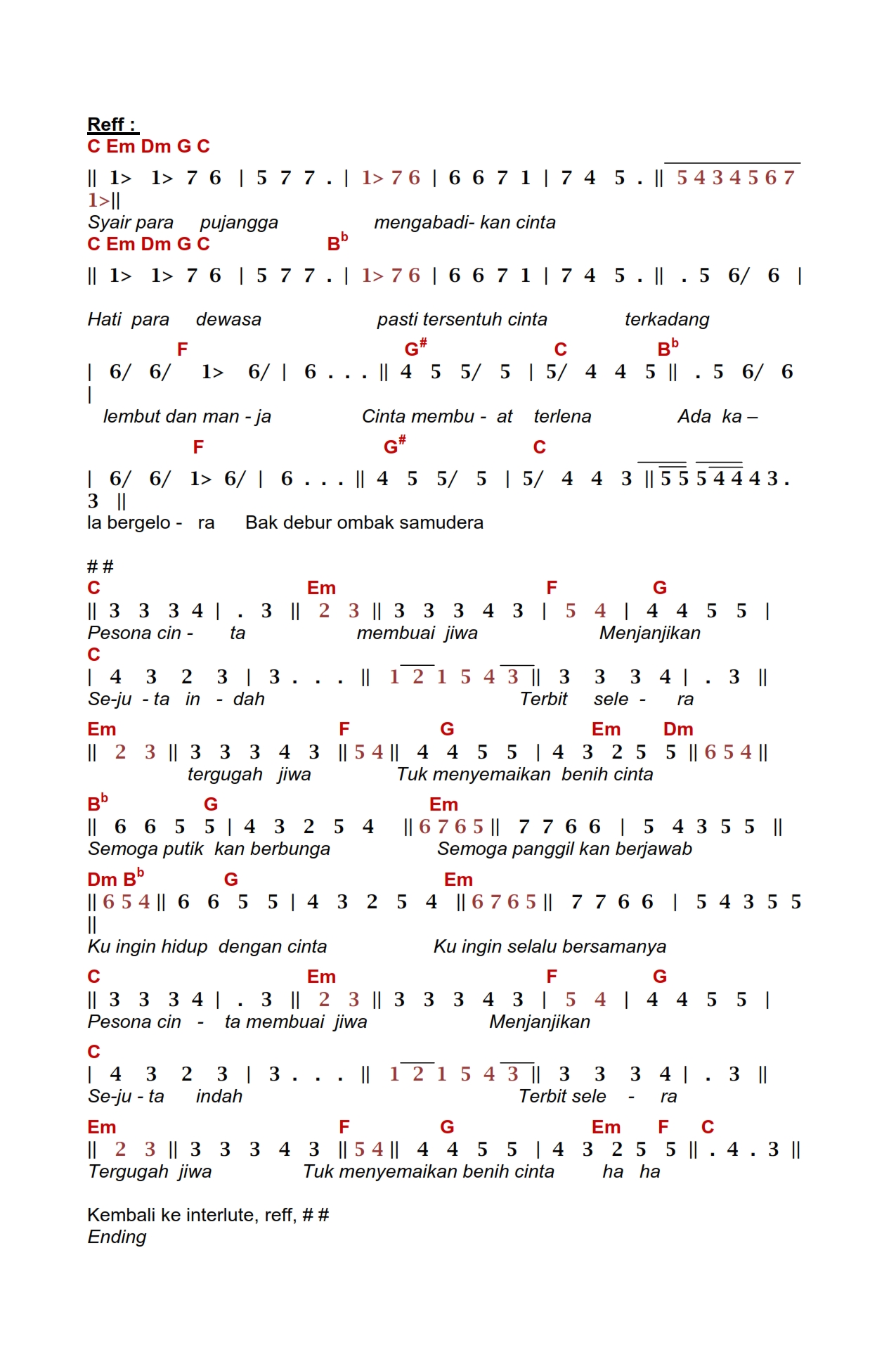 Untuk memudahkan membaca not angka, chord lagu, dan lirik, disini kami sajikan dalam bentuk gambar yang kami salin dari gubahan yang ditulis dengan word.