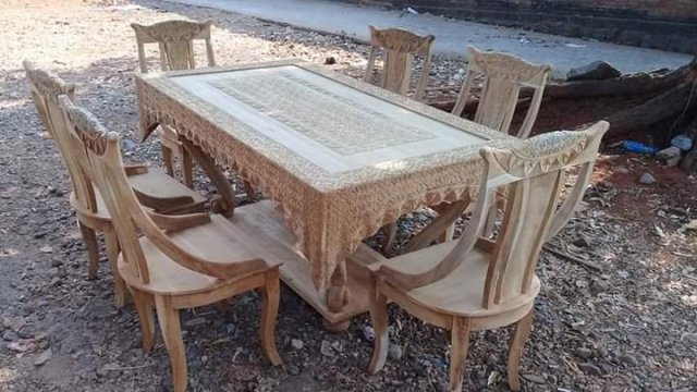 Berikut ini adalah meja kursi makan, ukiran yang belum finishing, tinggal memoles dan siap antar.