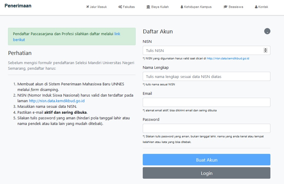 - Membuat akun di Sistem Penerimaan Mahasiswa Baru UNNES melalui form yang tersedia.