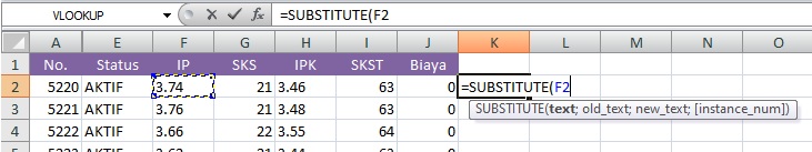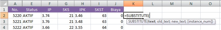 Pada K2 ketik samadenganSUBS (=SUBS) maka Excel akan membantu anda menekukan perintah yang akan digunakan klik SUBTITUTE