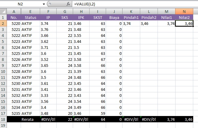 Sel yang akan kita gunakan meletakkan hasil pengubahan dari karakter ke angka di M2 dan N2, jadi meskipun K2 sudah tertulis 3,74 tetapi karena masih diposisi kiri cell maka itu berarti masih karakter atau huruf, coba perhatikan ini.
