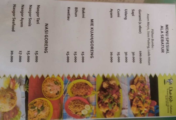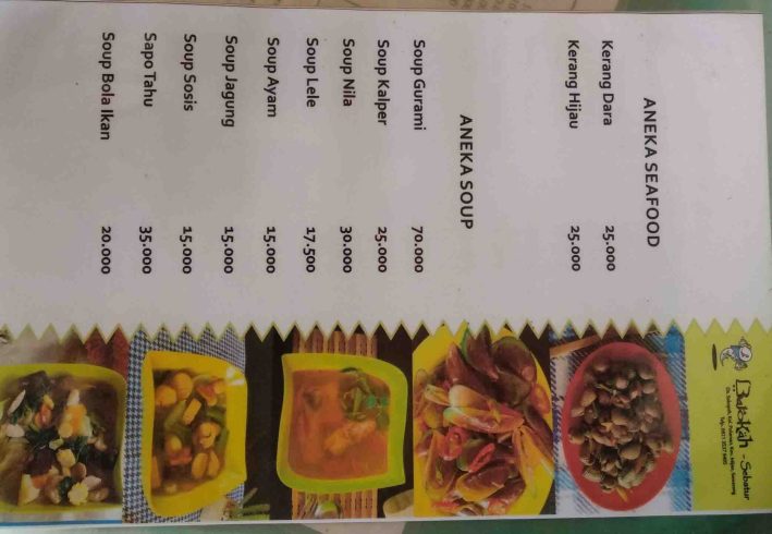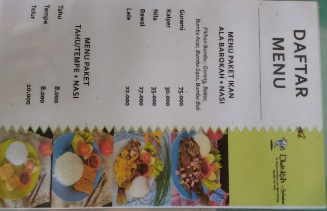 Daftar harga ini benar saat artikel ini diterbitkan, sedangkan jika ada perubahan dilokasi kuliner, maka yang benar ada harga-harga ditempat Pemancingan Barokah (baru) Sebatur.