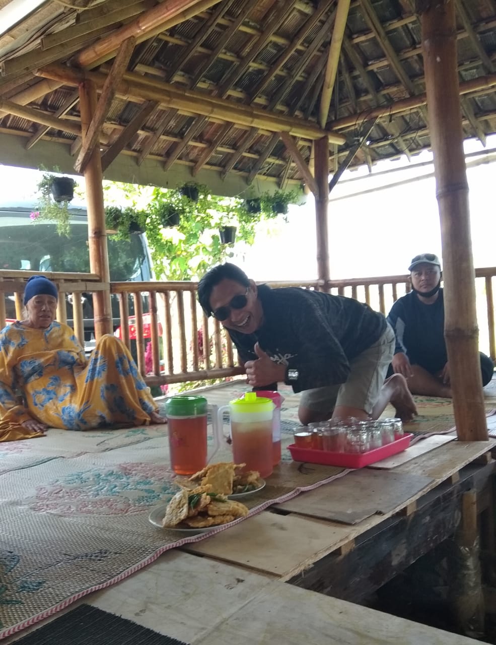 Minum teh dan es, dalam teko, plus ada yang kopi juga air putih, dan beberapa paket gorengan untuk penghantar obrolan ringan.