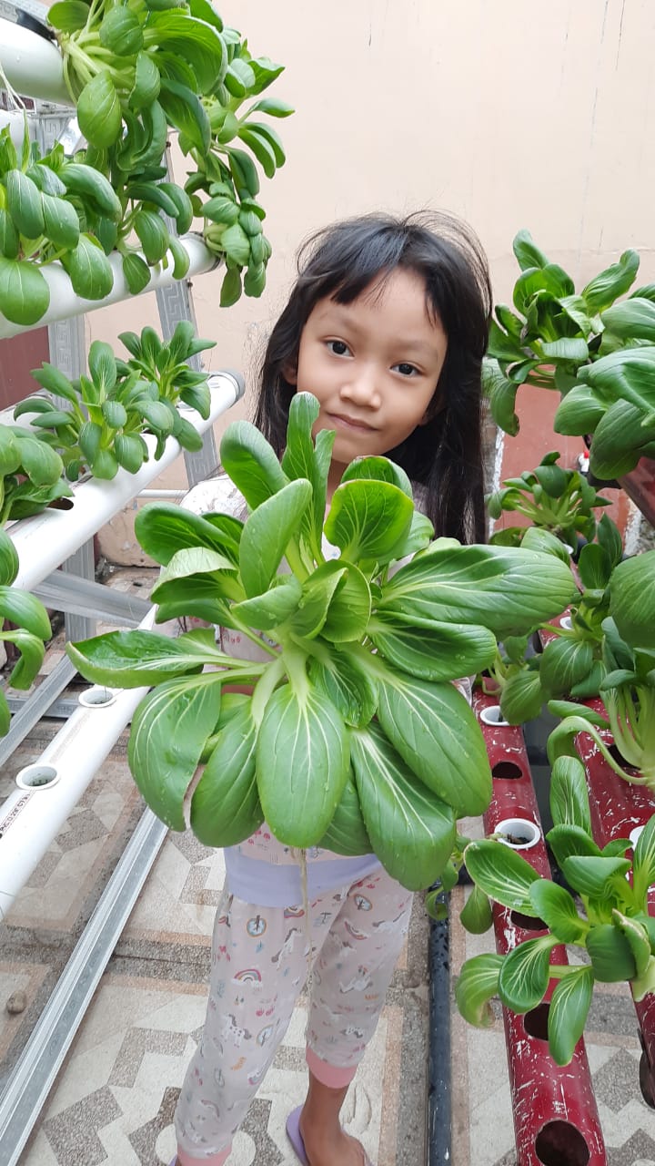 Ia selalu menampilkan cucunya yang centil, ia menaman berbagai sayur mayur dalam pot maupun di media hidroponik.