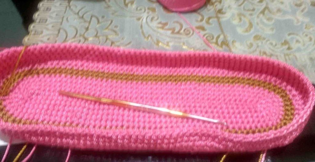 Alas tas rajut diberi sentuhan warna gold (seperti warna coklat, tetapi kalau beli bilangnya warna gold atau keemasan).