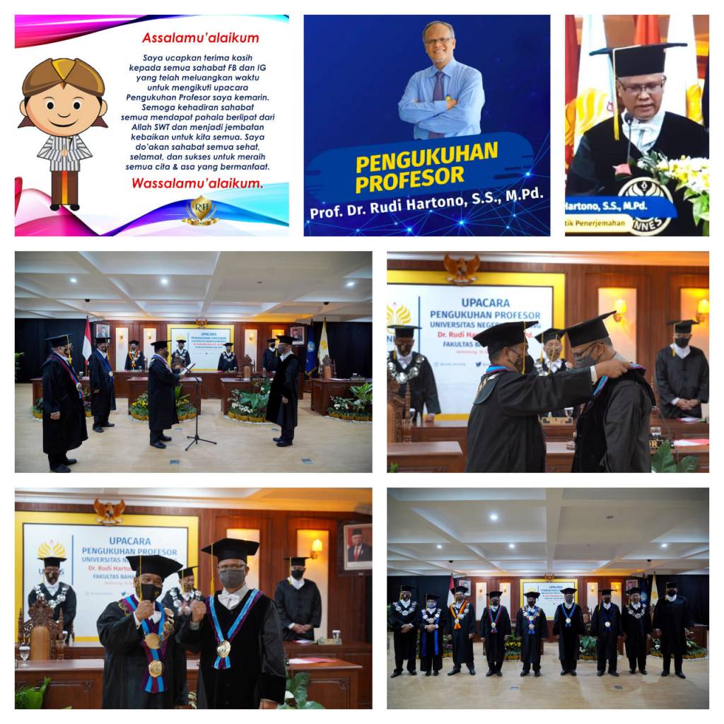 Rudi Hartono dikukuhkan sebagai Profesor Linguistik Penerjemahan dalam sebuah Upacara Pengukuhan Profesor 16 September 2020 bertempat di Ruang Rapat Senat Universitas Negeri Semarang.