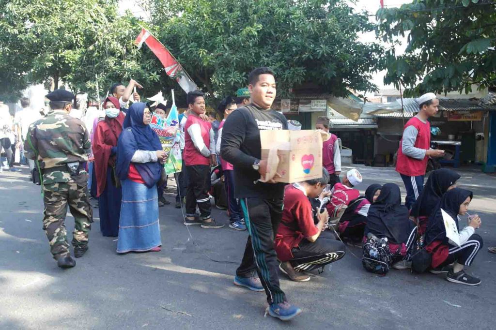 Istirahat minum pada saat Jalan Sehat Santri TPQ 2019 Se-Kecamatan Candisari (1/9) – pendamping mendistribusikan