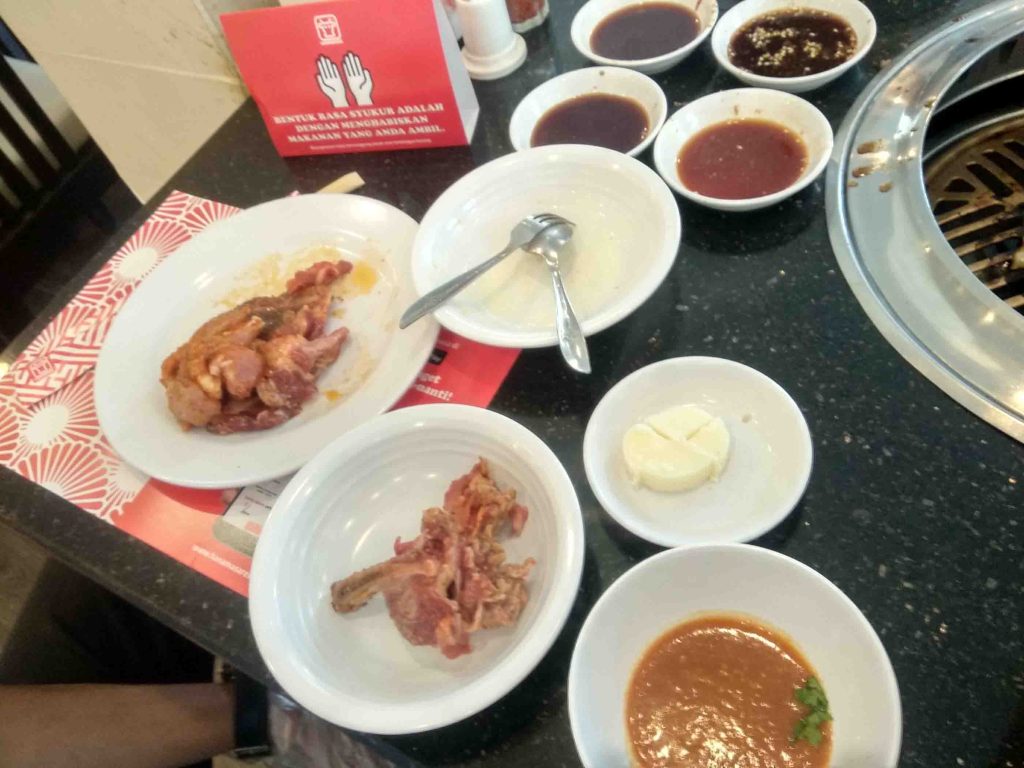 Saat memanggang, karena tidak terbiasa, jadilah alatnya gosong, dan ini mungkin tercium oleh teman saya yang pernah ke resto ini. Teman saya bilang, supaya tidak gosong ini alatnya dioles-olesi ini (benda kecil putih, bulat dibelah jadi empat).