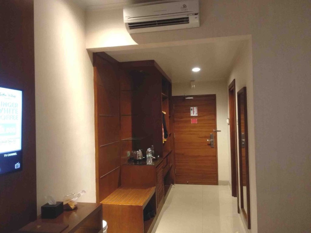 Fasilitas yang bisa kita nikmati disini yaitu standar hotel bintang 4 tentunya, meskipun kita berada di kamar deluxe, diantaranya penanak air untuk bikin teh atau kopi, almari pendingin, kursi santai sejumlah dua buah beserta mejanya.