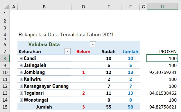 Misalnya baris 10 Kelurahan Jomblang, yang sudah valid ada berapa prosen, jika kita menggunakan prosentase maka tinggal memberikan rumus =+E10/F10 (=12/13) maka akan menghasilkan 0,923076923 kemudian di format prosentase 92% atau jika dibelakang koma ditampilkan dua angka akan tampak 92,31%