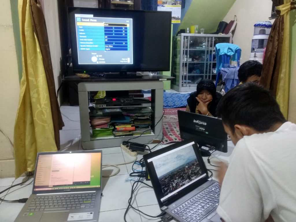 Upaya penyambungan tidak sukses karena TV-nya tidak mau koneksi dengan laptop yang kebetulan generasi baru dan generasi gamer. Alhamdulillah masih bisa dengan layar kecil.