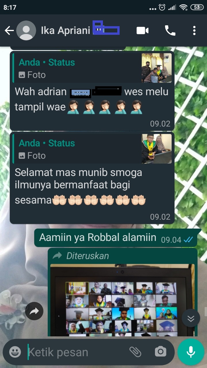 Eswede Weanind (Kissparry Semarang) menyampaikan terima kasih kepada kerabat, teman, tetangga, dan sahabat yang telah memberikan ucapan selamat atas di wisuda Alifiansyah AW dari Universitas Negeri Semarang pada wisuda periode Maret ke-105 tahun 2021.