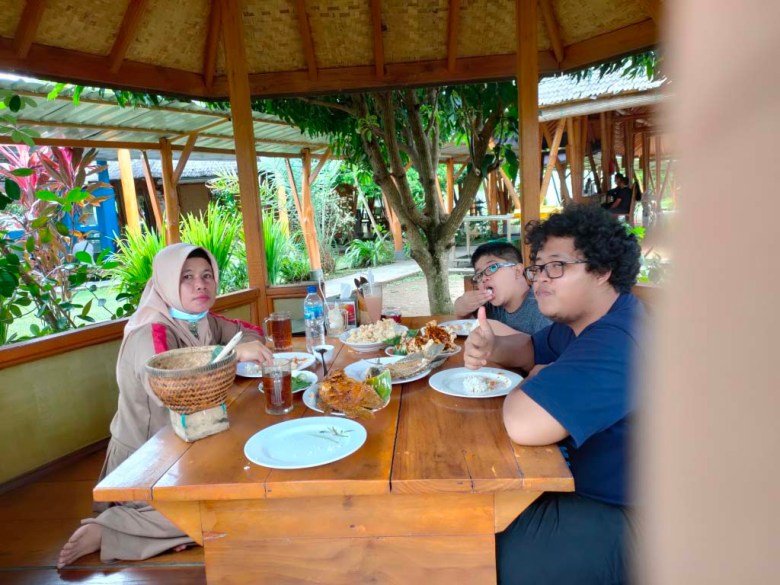 Sebelum lanjut ke destinasi kedua KissParry mencicipi menu masakan Kuliner di Gubuk Makan Mang Engking Sebroyot, menu makanan di sini ikan air tawar yang diambil dari kolam setempat, tentunya masih segar, ada juga menu makanan yang lain. Paling asyik disini kita dimanjakan dengan terapi ikan (gratis).