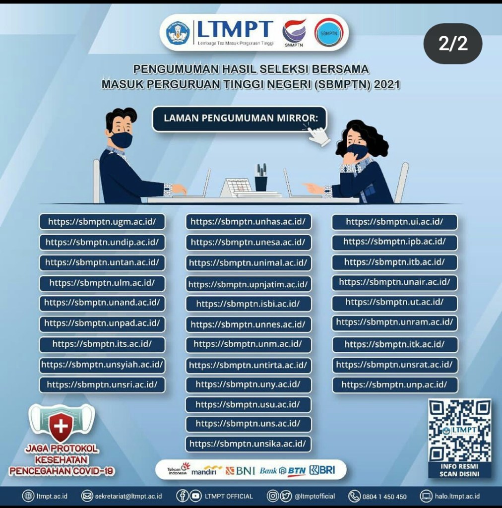 Berikut ini 30 laman mirror untuk pengumuman hasil SBMPTN Tahun 2021, silakan memilih salah satu yang terdekat dengan tempat tinggal Anda.
