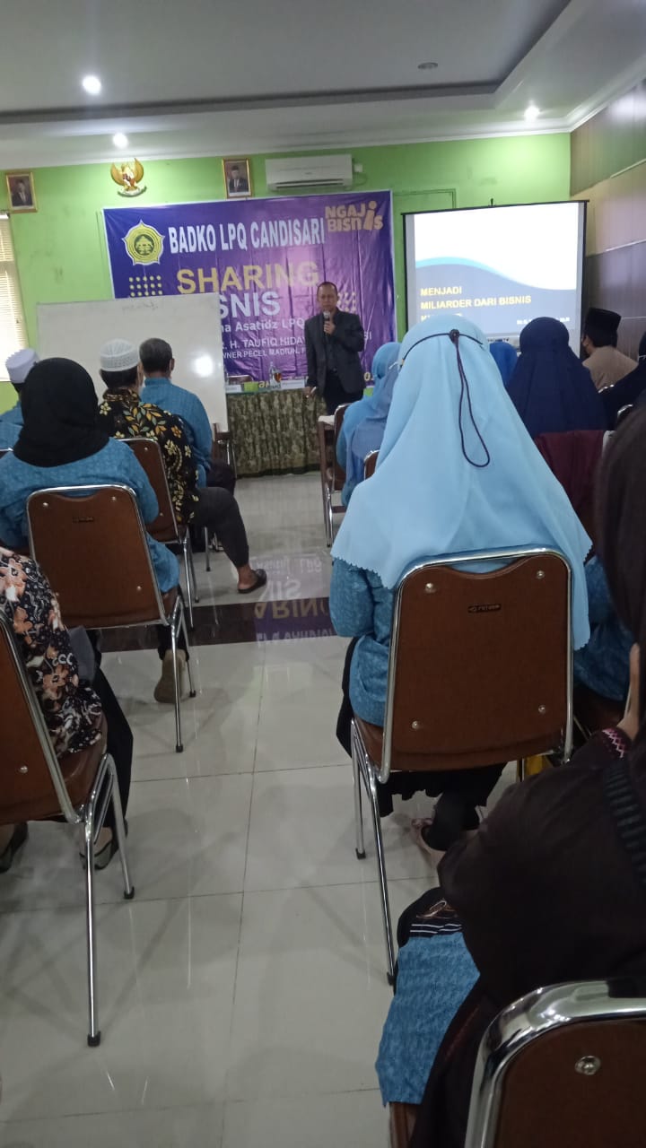 Sharing bisnis atau ngaji bisnis bersama asatidz/asatidzah (guru-guru/pengajar) di Taman Pendidikan Alquran pada Lembaga Pendidikan Alquran se Badko LPQ Kecamatan Candisari Kota Semarang, baru dilaksanakan pertama kali tersebut, sebagai narasumber langsung dari pakar dan pelaku usaha yaitu Dr. H. Taufik Hidayat, M.S.I.