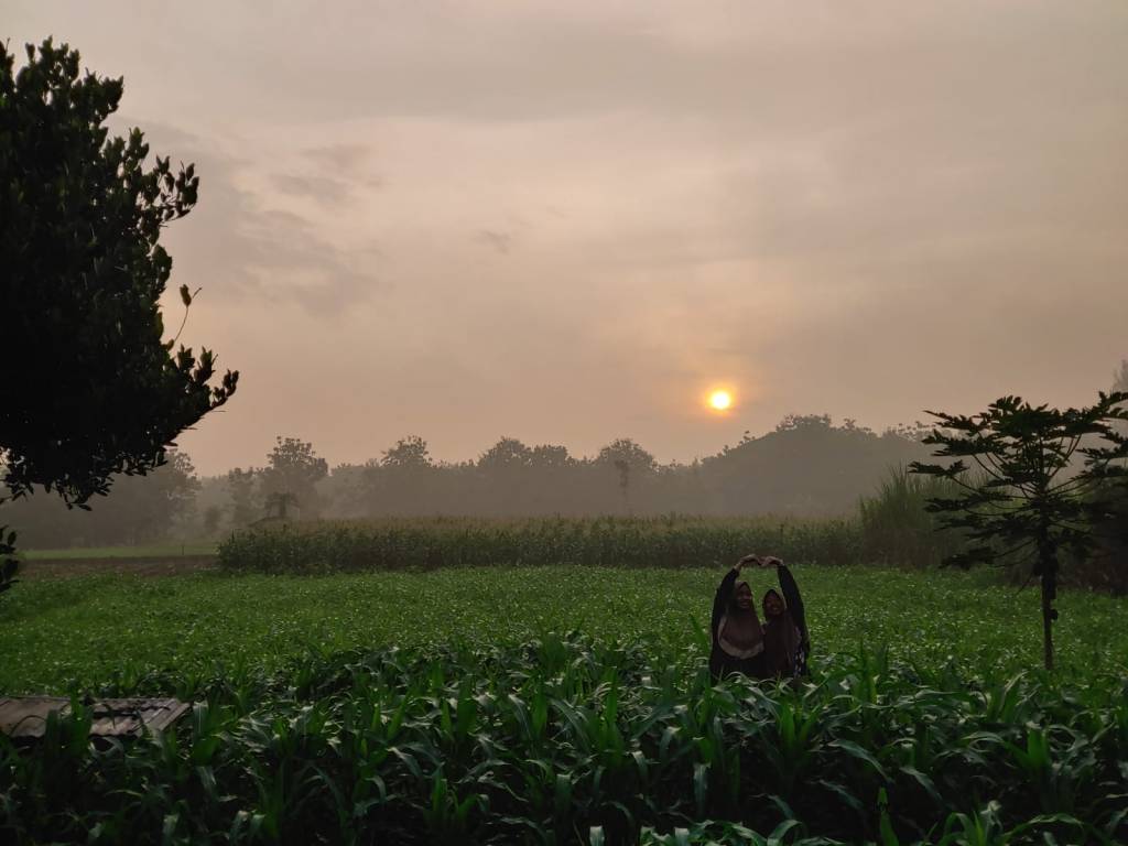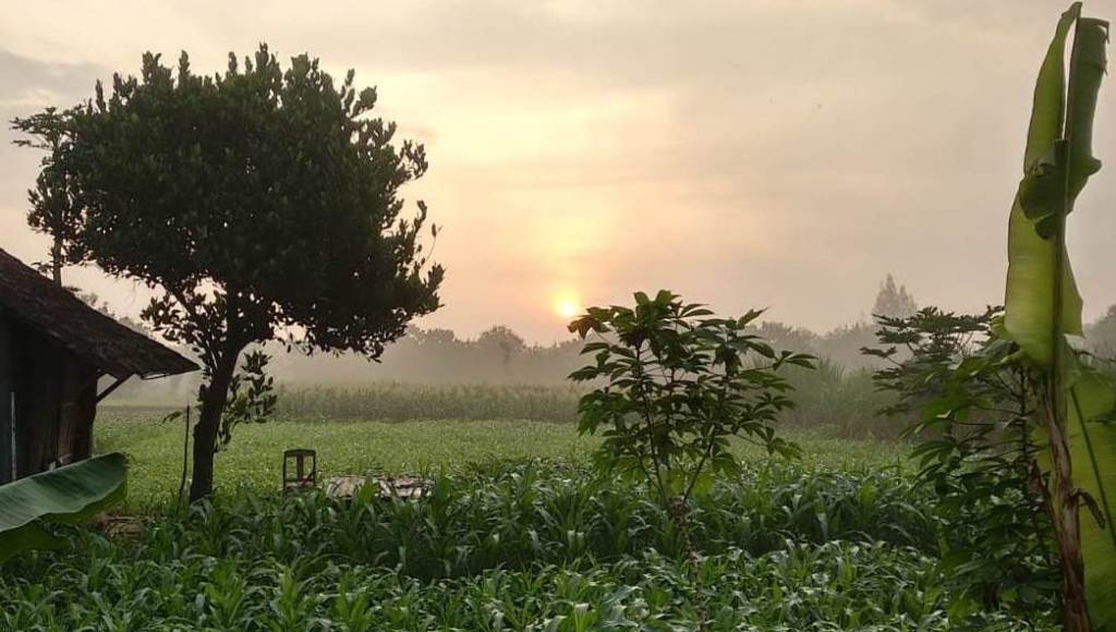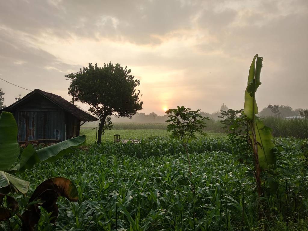 Menariknya disini, matahari terbit itu tampak diantara gundukan hijaunya pepohonan, terutama ini pohon jagung dan pohon tebu.