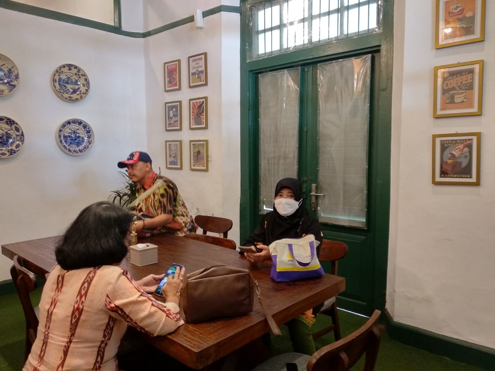 Di sini tersedia beberapa meja makan, dan di pajang barang-barang antik, termasuk di luar ruangan juga.