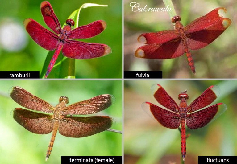 Neurothemis terminata memiliki tubuh yang didominasi warna merah gelap. Bagian sayap merah gelap dengan sedikit bagian transparan di ujung sayap. Sedangkan Neurothemis fulvia mudah ditandai dari bagian transparan di ujung sayapnya yang berbentuk bulat seperti koin. Spesies ini tersebar di daratan utama benua Asia dan jarang ditemukan di Indonesia.