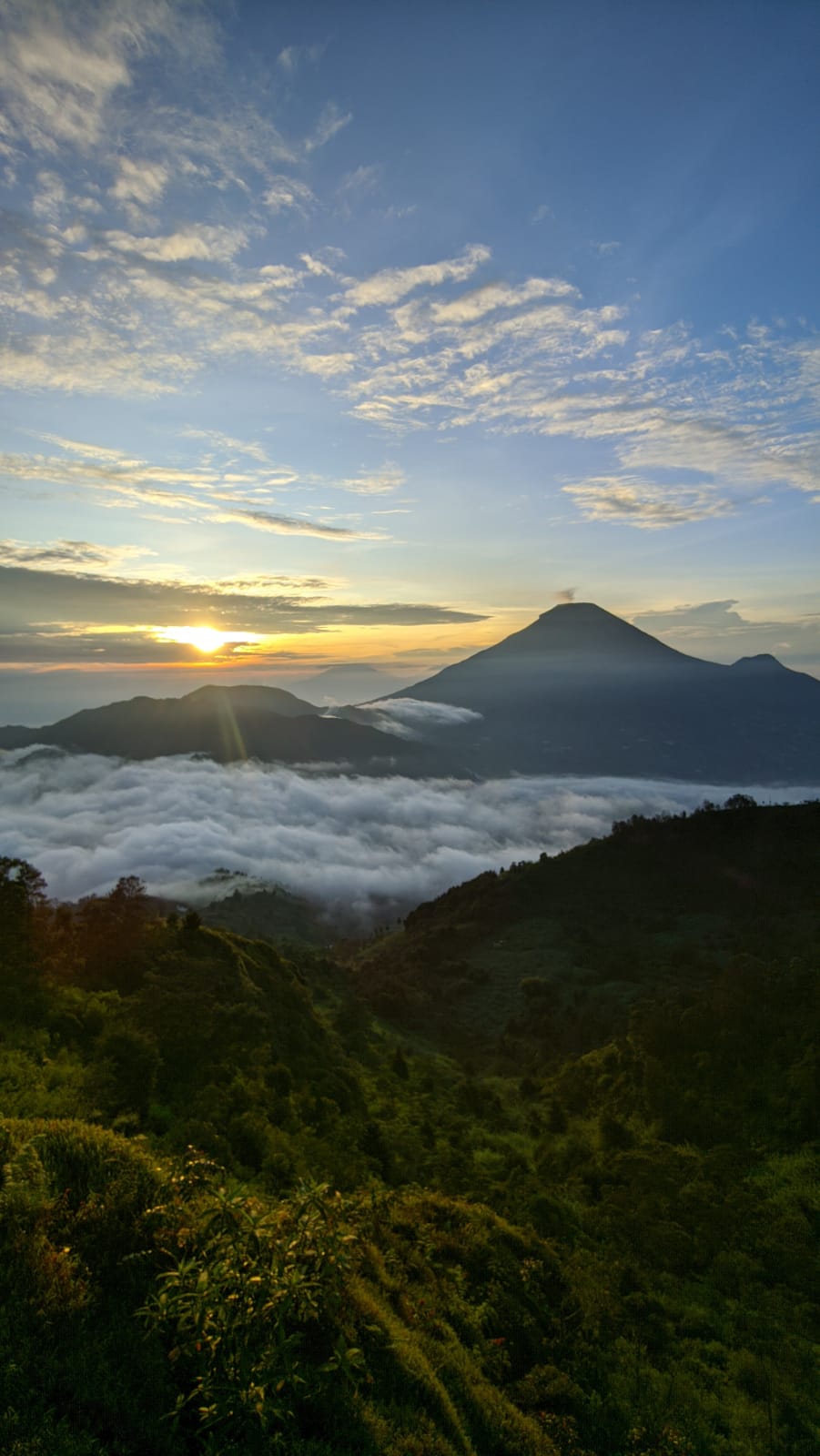 Hamparan awan putih pagi ini benar-benar memikat, kemudian ada gundukan puncak gunung menambah suasana semakin memukau.