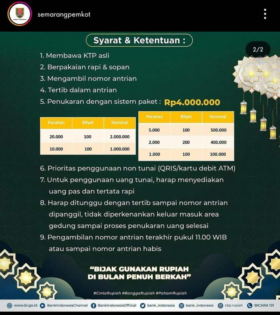 Sebanyak 9 syarat dan ketentuan dalam proses penukaran uang periode lebaran Idulfitri 1445 H/ 2024 M seperti dikutip dari selebaran dalam slide diatas.