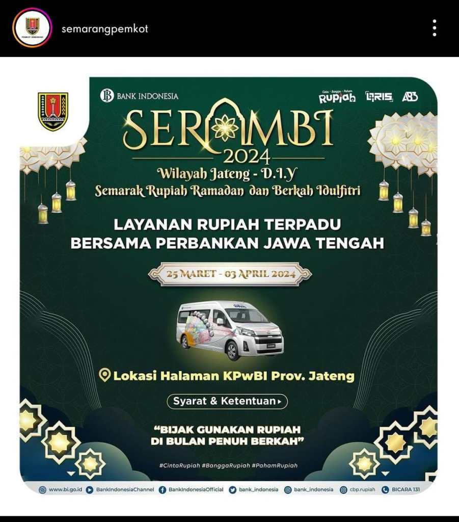 Layanan kali ini bertajuk “Serambi 2024 Semarak Rupiah Ramadan dan Berkah Idul Fitri” – Layanan Rupiah Terpadu Bersama Perbankan Jawa Tengah, dengan kegiatan dipusatkan di Halaman KPwBI Prov. Jateng. KPwBI = Kantor Perwakilan Wilayah Bank Indonesia Jawa Tengah. Alamat Jl Imam Bardjo SH No. 4 Pleburan (depan Sekolah Pascasarjana Undip Pleburan) Kec. Semarang Selatan Kota Semarang.