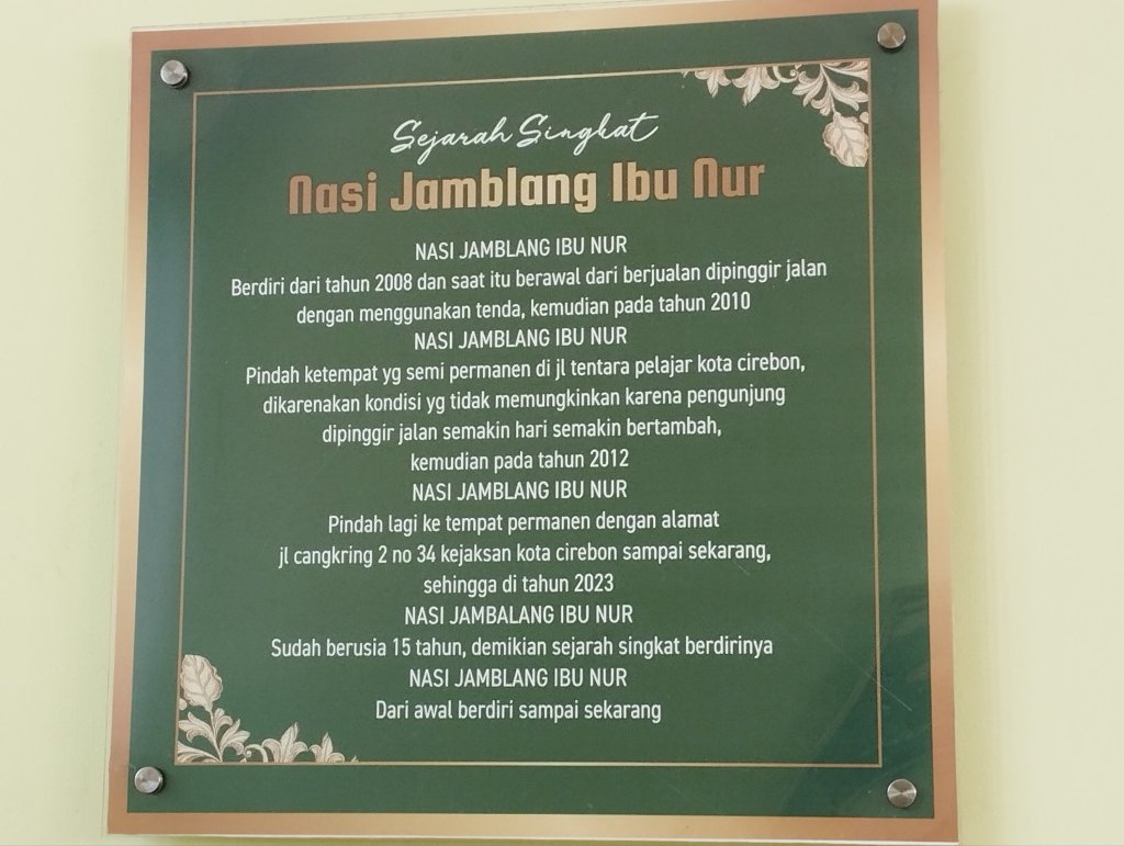 Sejarah singkat Nasi Jomblang Ibu Nur terpajang dalam pigura di lantai 2, dan mushola yang cukup luas tersedia di lantai dua.