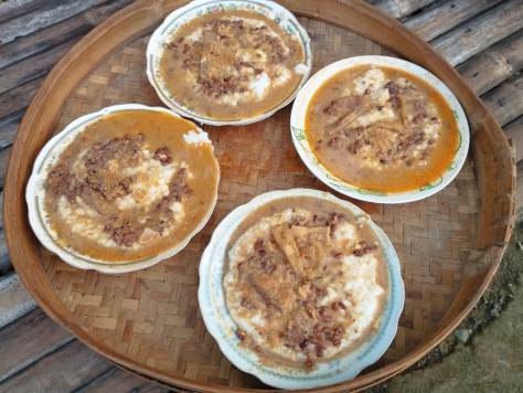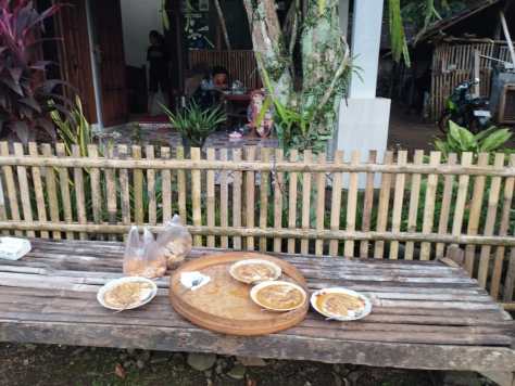 Dengan tampah harapan kami bisa dimuat beberapa piring, tetapi ternyata hanya bisa memuat 4 buah piring yang penuh dengan bubur lemu.