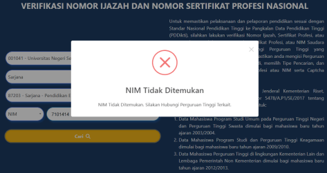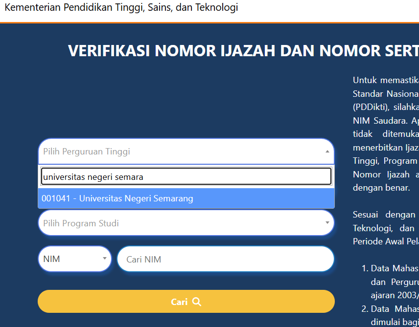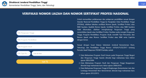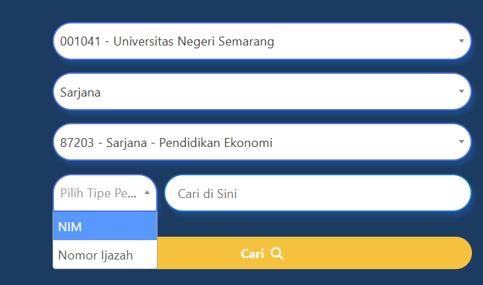 Ikuti isian formulir dengan cara mengetik sebagian detil kunci pencarian, karena sebagian besar isian memilih atau Pilih, kecuali kunci utama NIM atau Nomor Ijazah/Sertifikat Profesi.