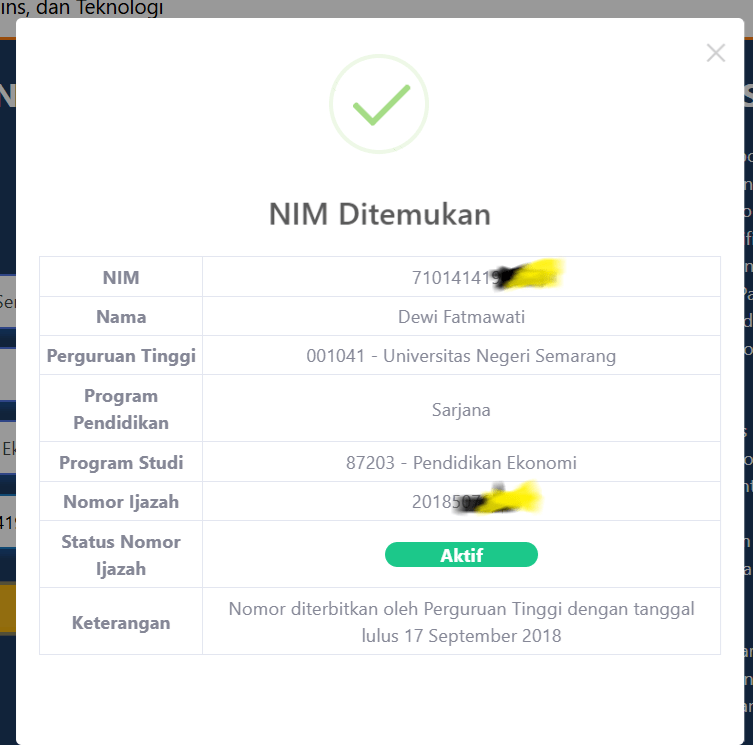 Berikut ini merupakan contoh tampilan data yang diketemukan dalam pencarian. Sebagai contoh saya adalah lulusan Universitas Negeri Semarang, maka apakah data saya ada di SIVIL — ehh PISN –.