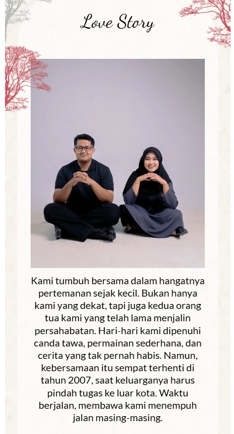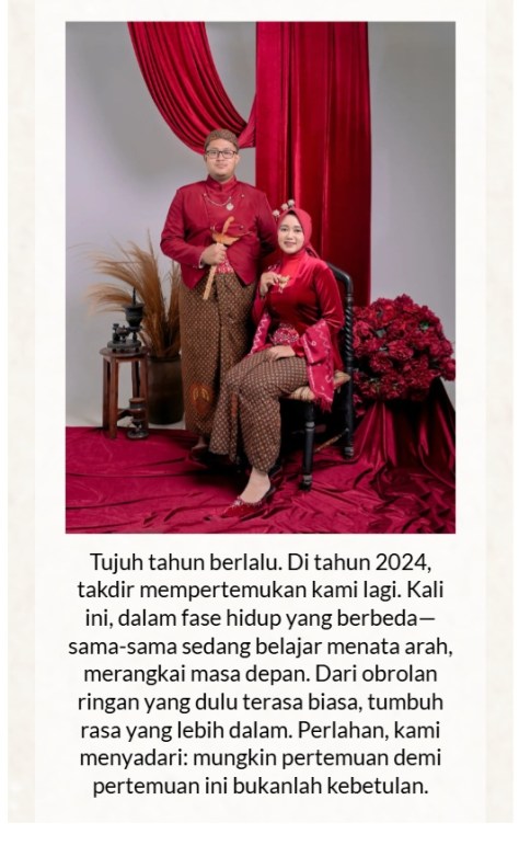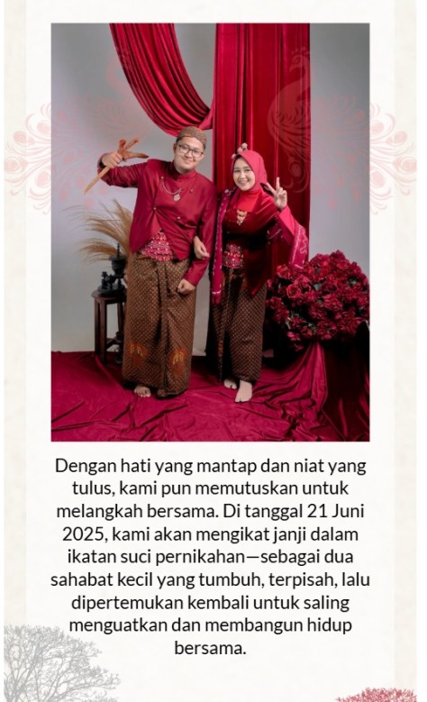 Di tanggal 21 Juni 2025, kami akan mengikat janji dalam ikatan suci pernikahan – sebagai dua sahabat kecil yang tumbuh, terpisah, lalu dipertemukan kembali untuk saling menguatkan dan membangun hidup bersama.