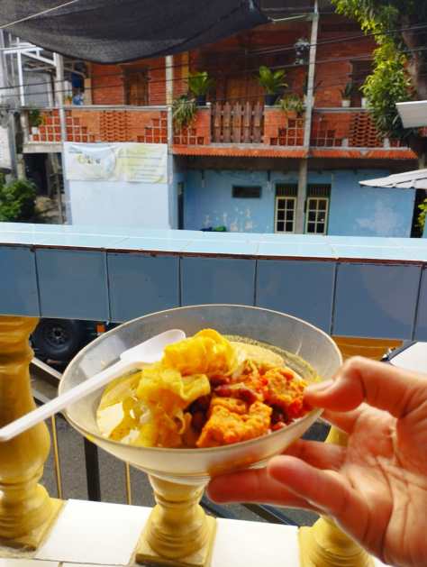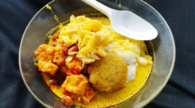 Bubur ini diberi sambel goreng tahu, menggunakan santan agak kental dan sedikit pedas, sesuai dengan selera masing-masing.