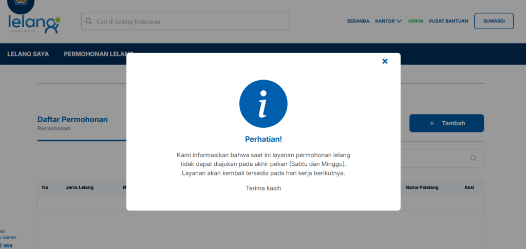 Sebaiknya keluar dari aplikasi lelang, menunya ada di bawah Profil. Silakan masuk ke aplikasi lagi, apakah sudah disetujui sebagai peserta lelang.